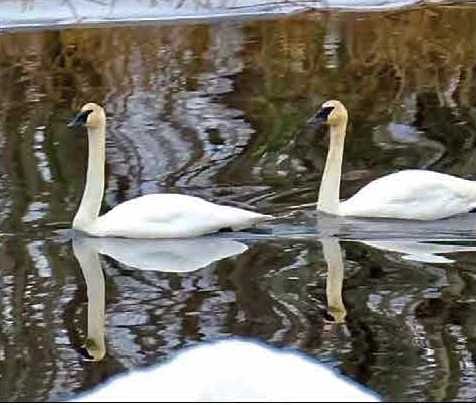 SWAN LAKE – It’s exciting to see huge beautiful trumpeter swans. This pair went sailing serenely by me on the Mississippi River that runs out of Dalhousie Lake.